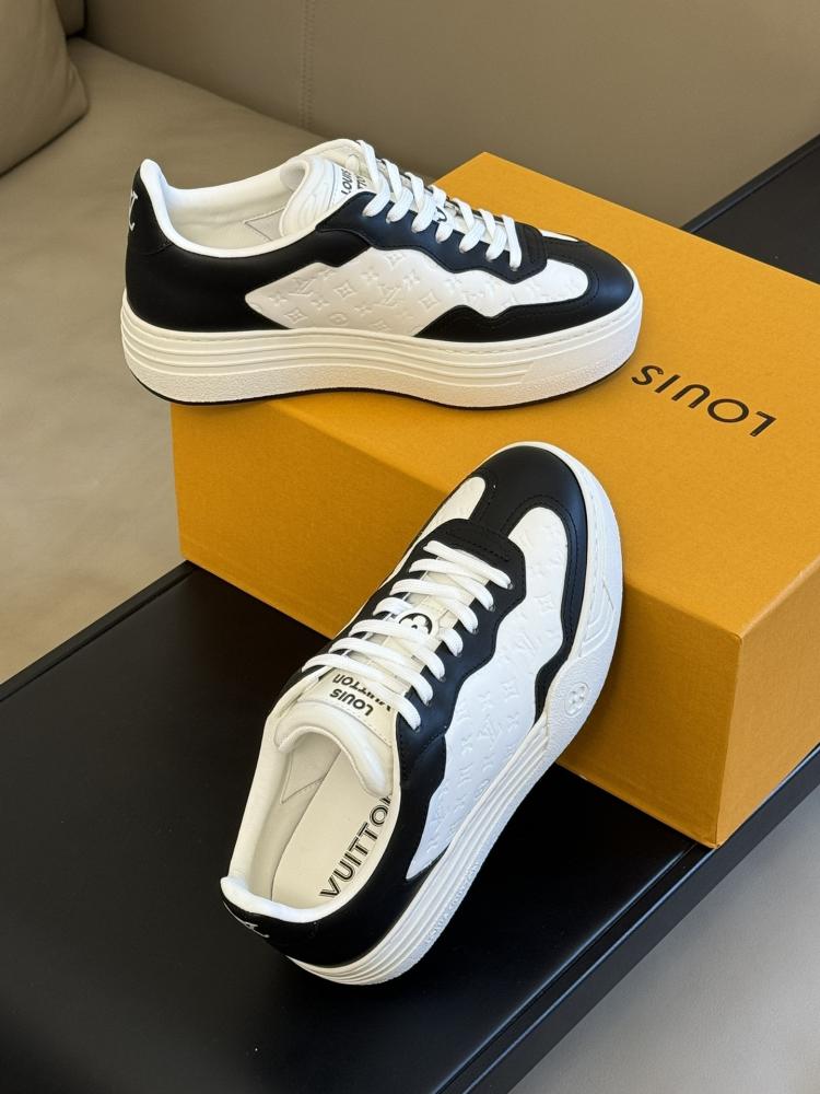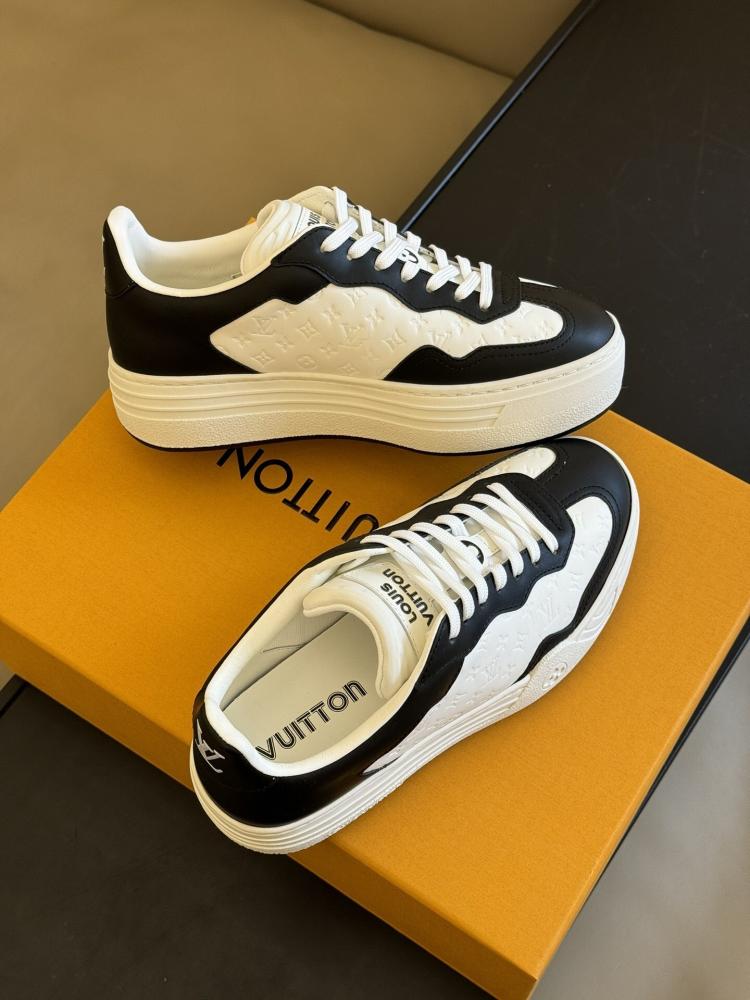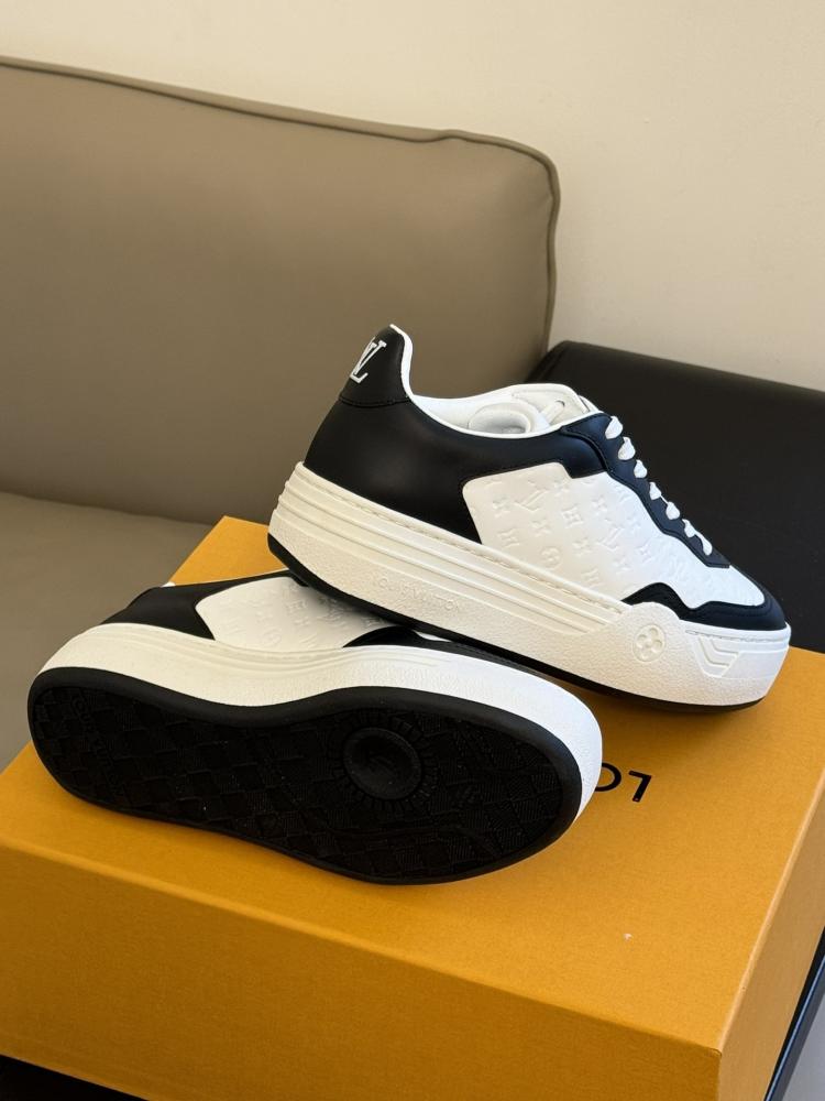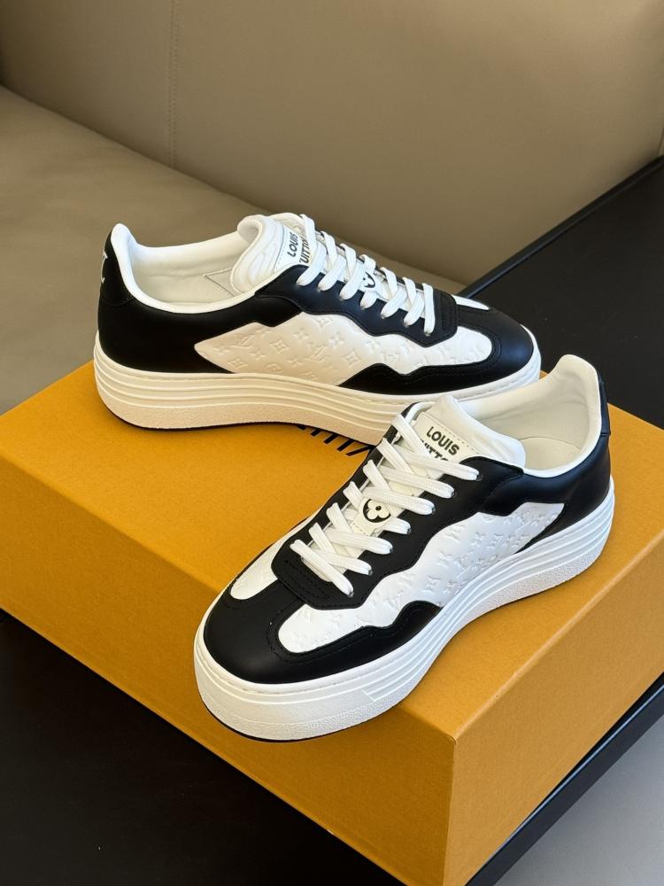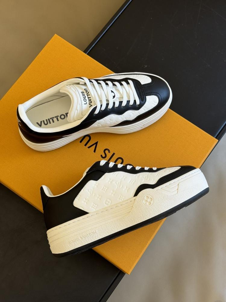 تميّز بإطلالة أنيقة وعصرية مع حذاء Louis Vuitton الرياضي باللونين الأسود والأبيض. تصميم جذاب يجمع بين الفخامة والراحة، مع نقش المونوجرام المميز على الجوانب ونعل سميك يعزز من ثبات القدم وأناقتها.