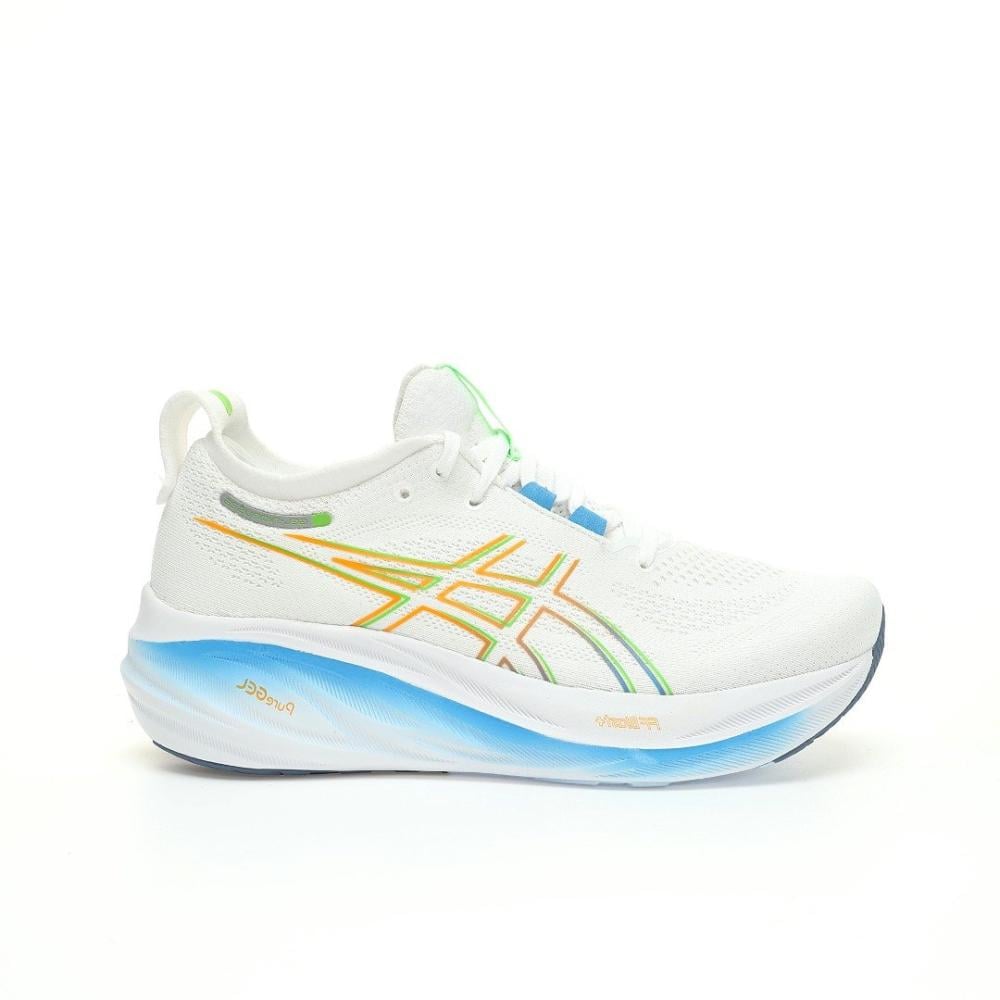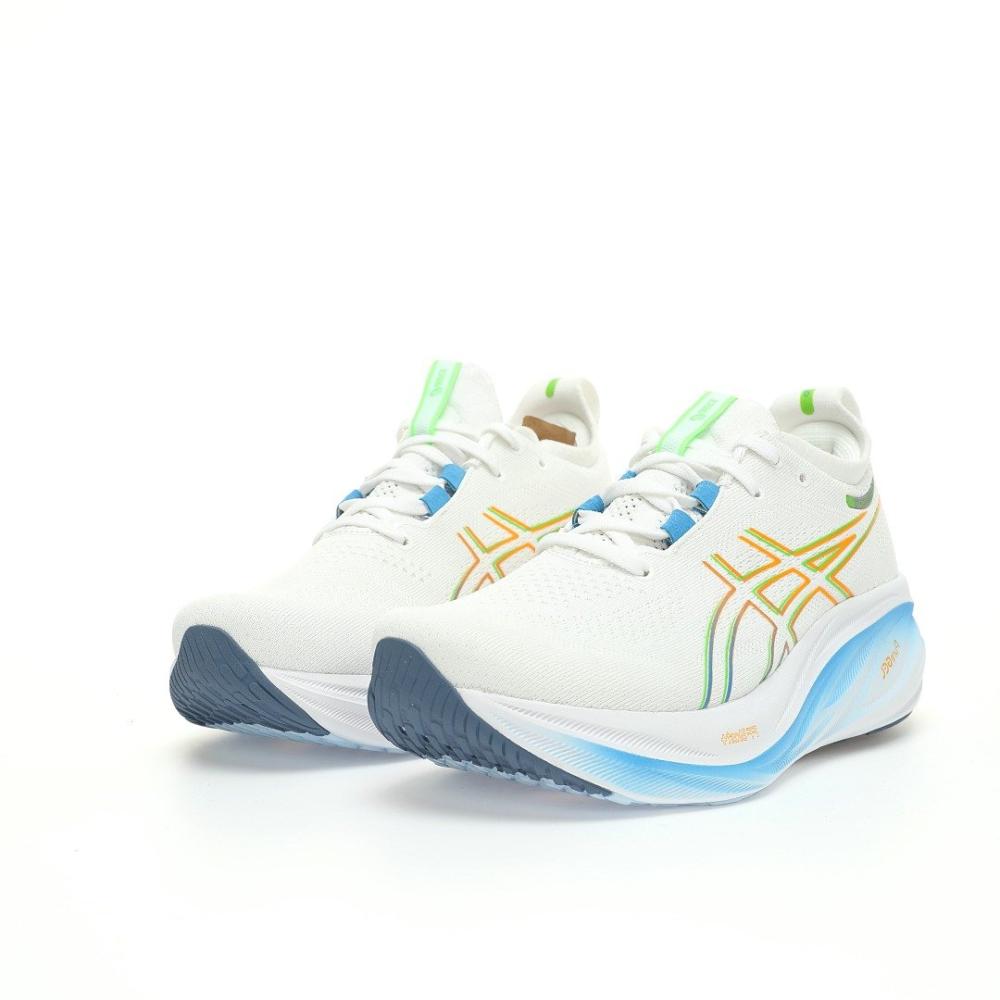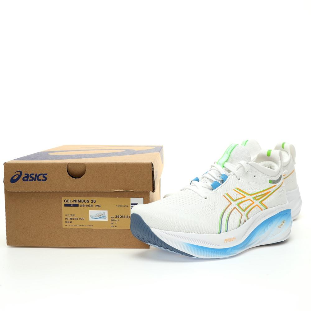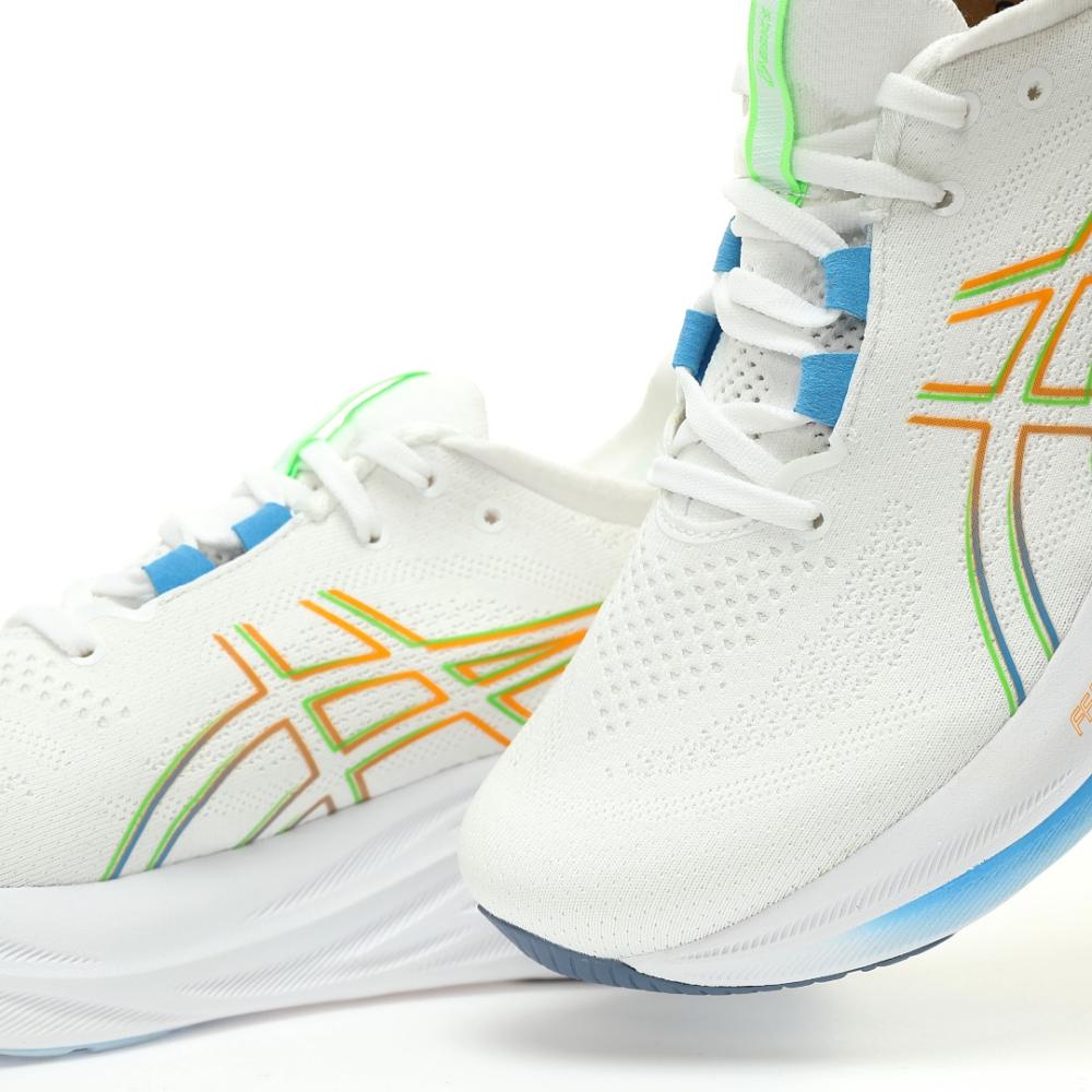 • تفاصيل إضافية: الأربطة باللون الأبيض تندمج مع الجزء العلوي مع لمسات بالأزرق والأخضر والبرتقالي في بعض الأجزاء. منطقة الكعب والياقة مبطنة بشكل مريح لدعم الكاحل وتقليل الاحتكاك مع تفاصيل بالأبيض والأزرق والأخضر والبرتقالي. شعار ASICS يظهر بوضوح على الجانب بألوان متعددة. الحذاء معروض بجانب علبته الأصلية اللي تحمل شعار ASICS واسم الموديل.
