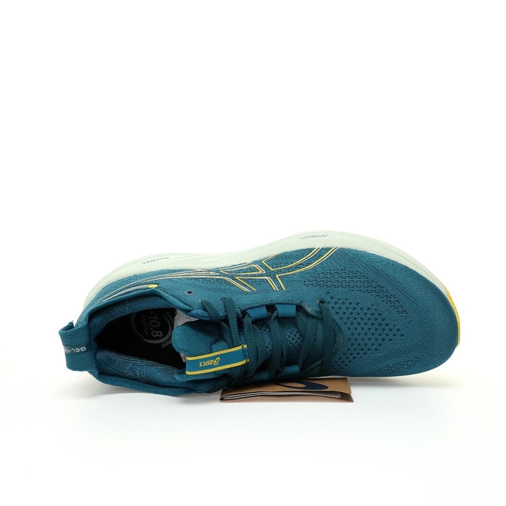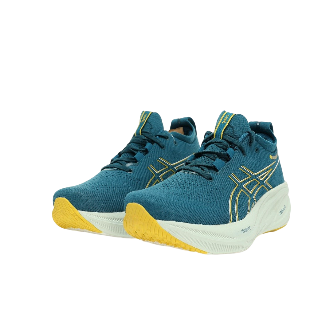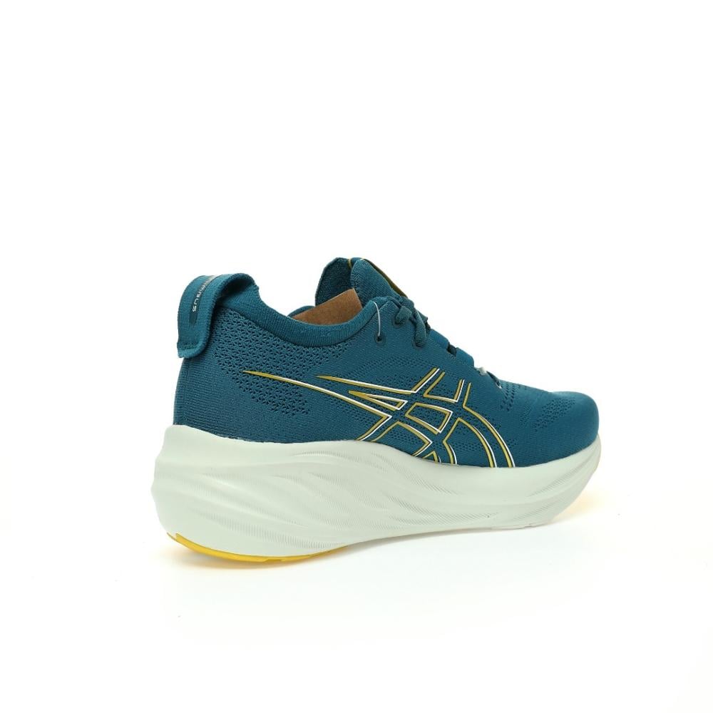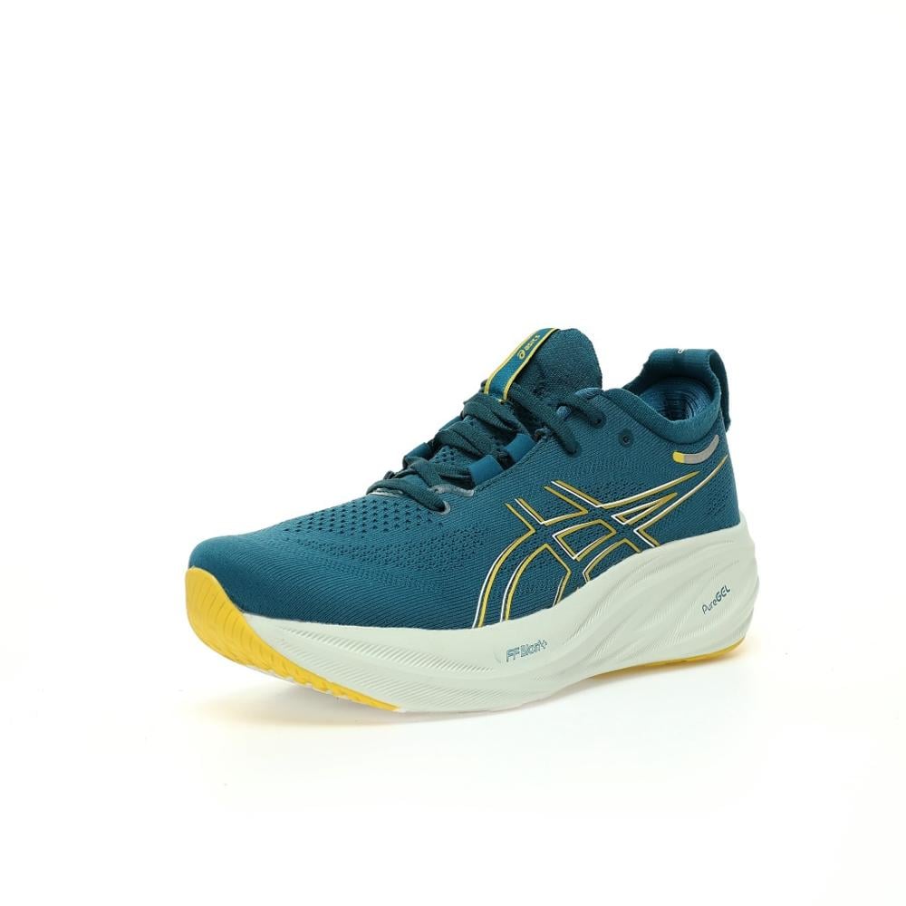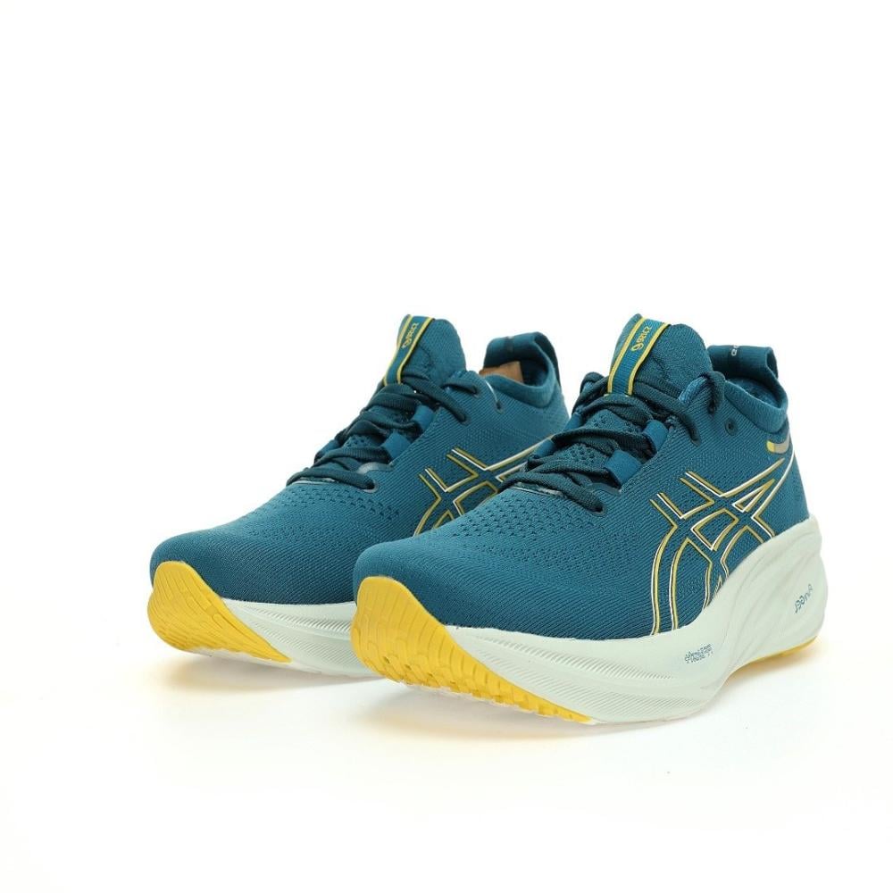 - اللون: في هذي اللقطة، الحذاء كله جاي بلون أزرق مخضر أو بترولي أنيق وعصري في الجزء العلوي مع شعار ASICS باللون الذهبي أو الأصفر الخردلي بشكل بارز. النعل الأوسط يجي بلون أبيض كريمي مع طبقة باللون الأصفر الخردلي في الأسفل والنعل الخارجي أسود مع لمسات صفراء. هالتوليفة اللونية أنيقة وعصرية.