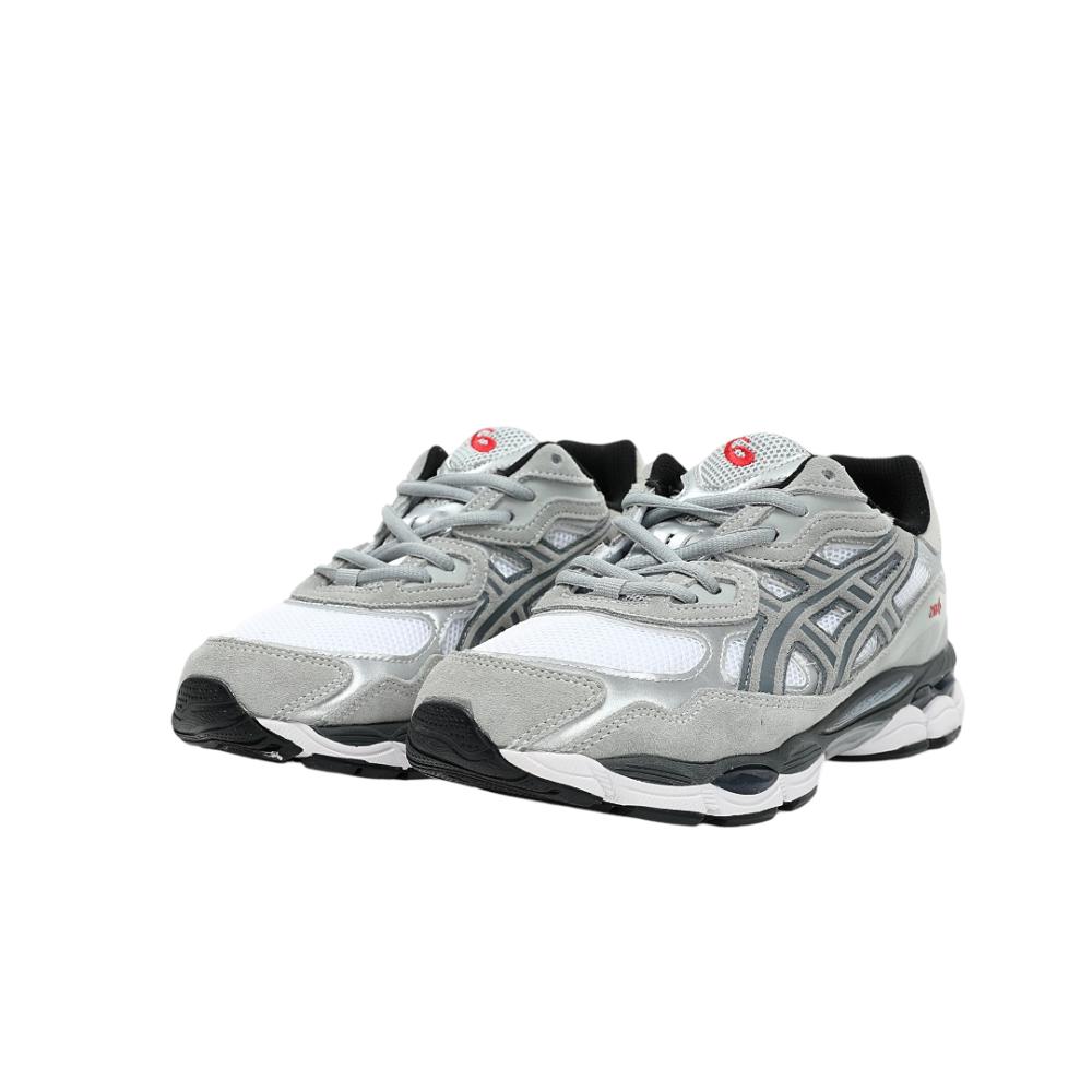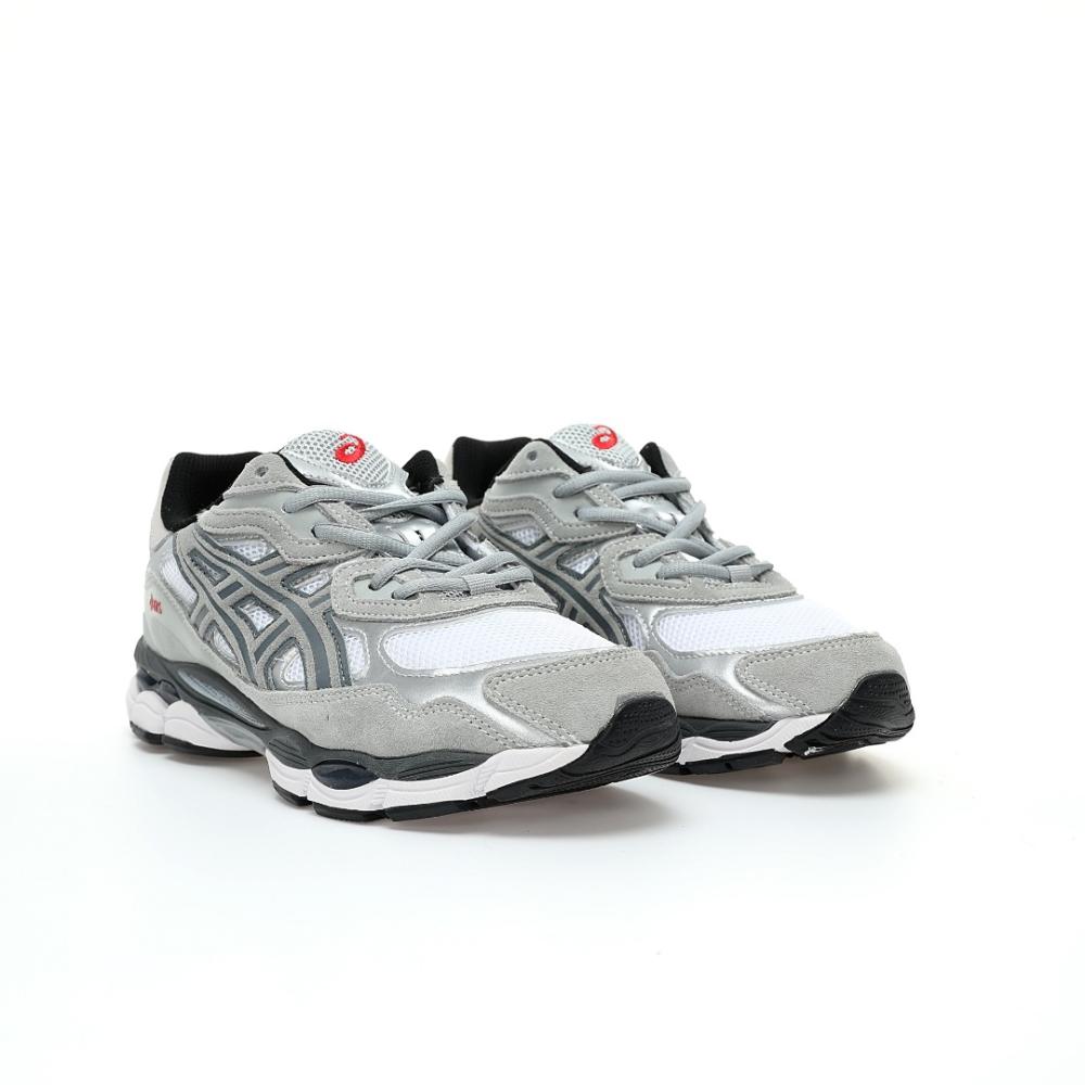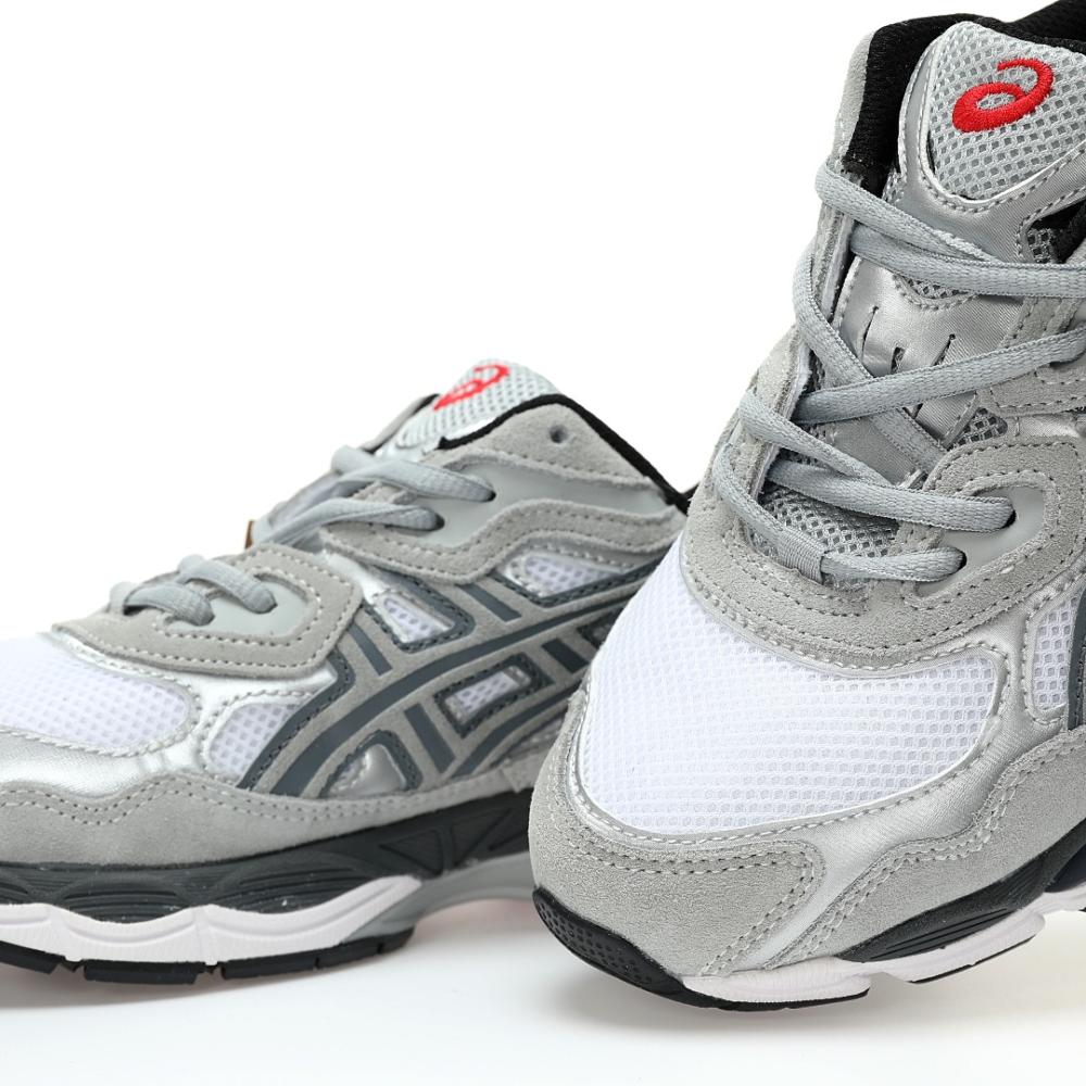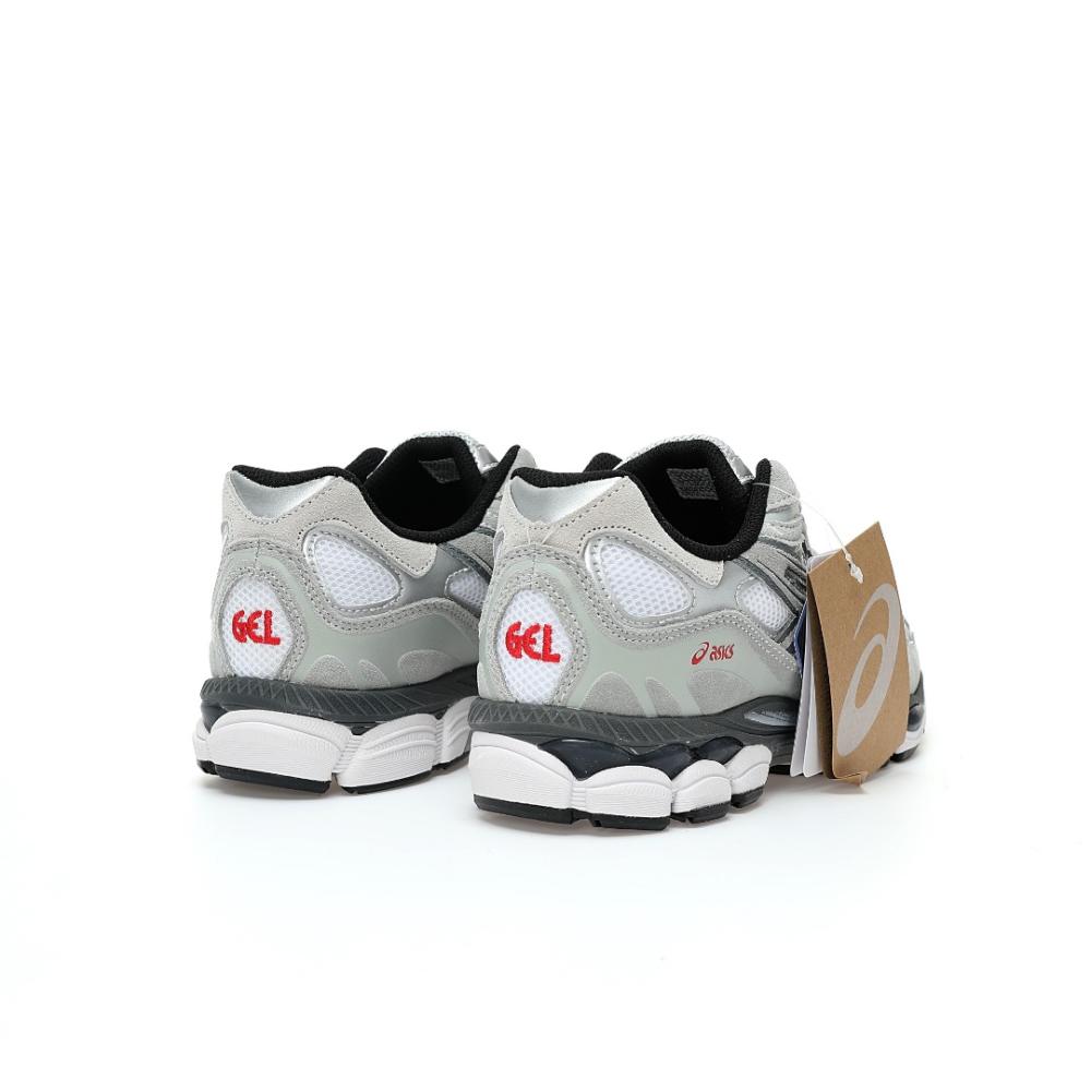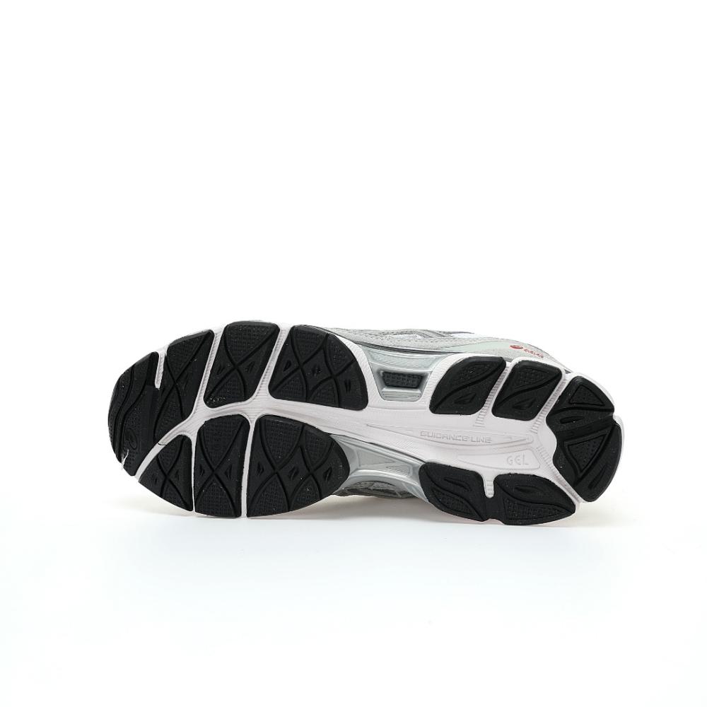 - تفاصيل إضافية: يتميز بنظام أربطة تقليدي باللون الرمادي. منطقة الكعب والياقة مبطنة بشكل مريح لدعم الكاحل وتقليل الاحتكاك مع تفاصيل بالأبيض والفضي والرمادي والأسود وشعار ASICS باللون الأحمر على اللسان. شعار ASICS يظهر بوضوح على الجانب.