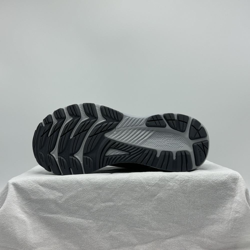 - النعل الخارجي (Outsole): الجزء السفلي مصنوع من مطاط متين ومقاوم للتآكل (AHARPLUS) في المناطق الأكثر عرضة للاحتكاك، وهذا يضمن عمر افتراضي طويل للحذاء وثبات ممتاز على مختلف الأسطح. تصميم الأخاديد والنقوش مدروس لتوفير grip ممتاز أثناء الحركة، مع إضافة اللون الأبيض في بعض الأجزاء.