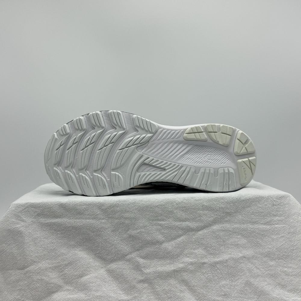 - النعل الخارجي (Outsole): الجزء السفلي مصنوع من مطاط متين ومقاوم للتآكل (AHARPLUS) في المناطق الأكثر عرضة للاحتكاك، وهذا يضمن عمر افتراضي طويل للحذاء وثبات ممتاز على مختلف الأسطح. تصميم الأخاديد والنقوش مدروس لتوفير grip ممتاز أثناء الحركة، مع إضافة اللون الأبيض والأزرق الداكن في بعض الأجزاء.