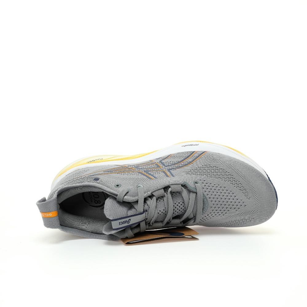 - تفاصيل إضافية: الأربطة باللون الرمادي تندمج مع الجزء العلوي مع لمسات برتقالية في بعض الأجزاء. منطقة الكعب والياقة مبطنة بشكل مريح لدعم الكاحل وتقليل الاحتكاك مع تفاصيل باللون الرمادي والأبيض والبرتقالي. شعار ASICS يظهر بوضوح على الجانب باللون الأبيض المحدد بالبرتقالي. الحذاء معروض بجانب علبته الأصلية اللي تحمل شعار ASICS واسم الموديل.
