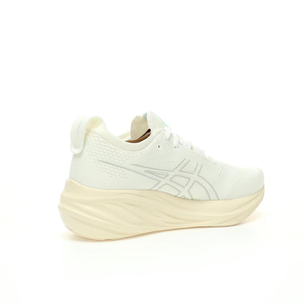 - تفاصيل إضافية: الأربطة باللون الأبيض الكريمي تندمج مع الجزء العلوي مع لمسات فاتحة أخرى. منطقة الكعب والياقة مبطنة بشكل مريح لدعم الكاحل وتقليل الاحتكاك مع تفاصيل باللون الأبيض الكريمي والفضي أو الرمادي الفاتح. شعار ASICS يظهر بوضوح على الجانب باللون الفضي أو الرمادي الفاتح. الحذاء معروض بجانب علبته الأصلية اللي تحمل شعار ASICS واسم الموديل.