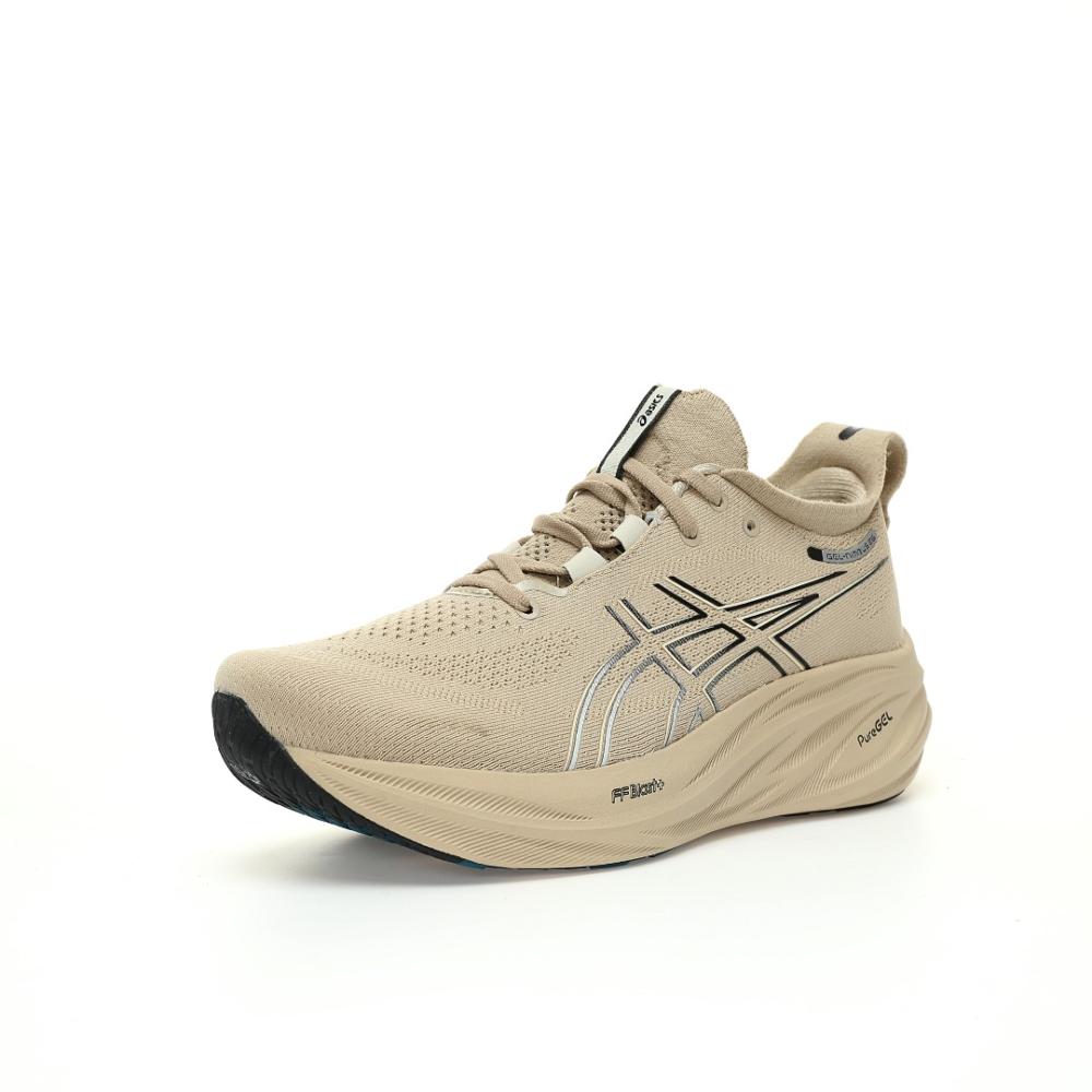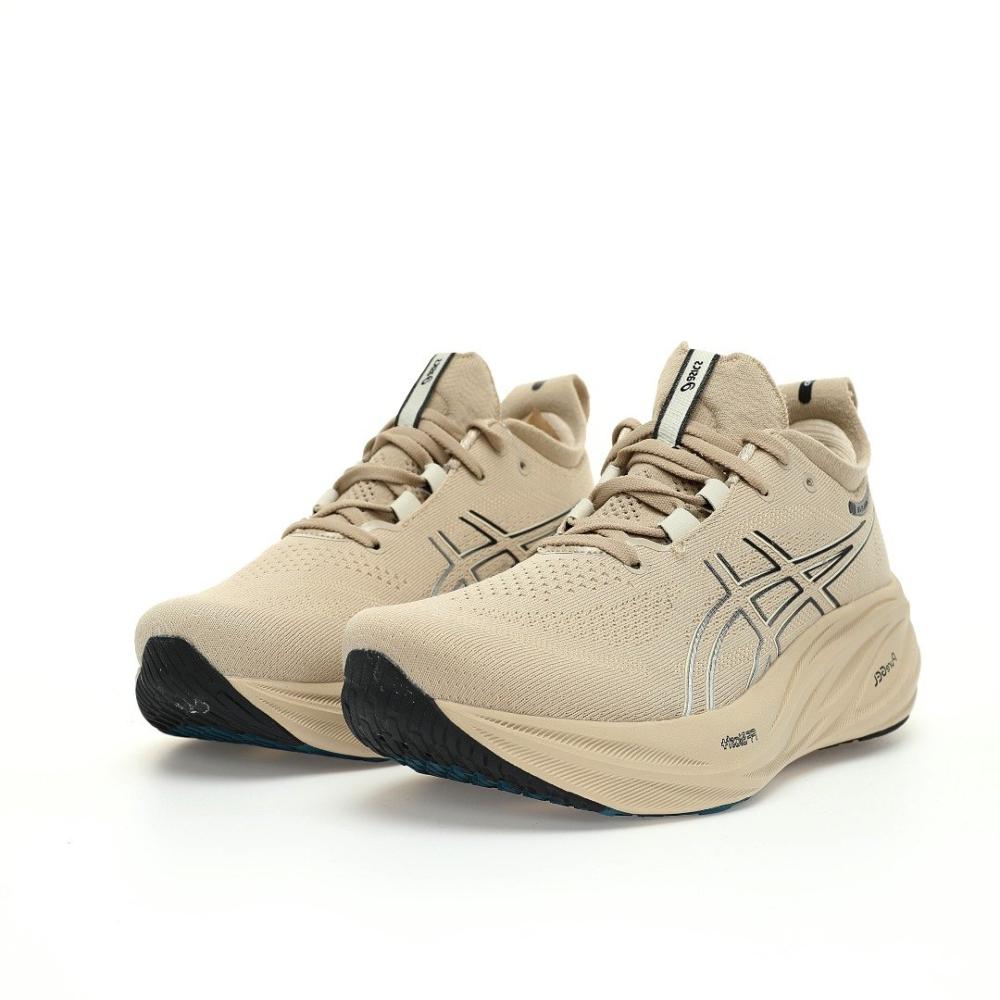 - تفاصيل إضافية: الأربطة باللون البيج تندمج مع الجزء العلوي. منطقة الكعب والياقة مبطنة بشكل مريح لدعم الكاحل وتقليل الاحتكاك مع تفاصيل باللون البيج والأسود أو الأزرق الداكن. شعار ASICS يظهر بوضوح على الجانب باللون الفضي أو الرمادي الفاتح. الحذاء معروض بجانب علبته الأصلية اللي تحمل شعار ASICS واسم الموديل.