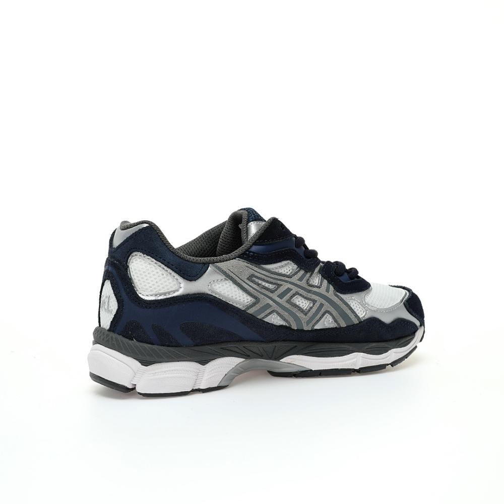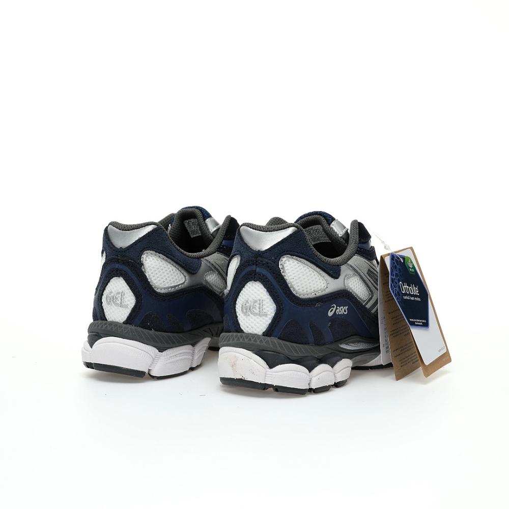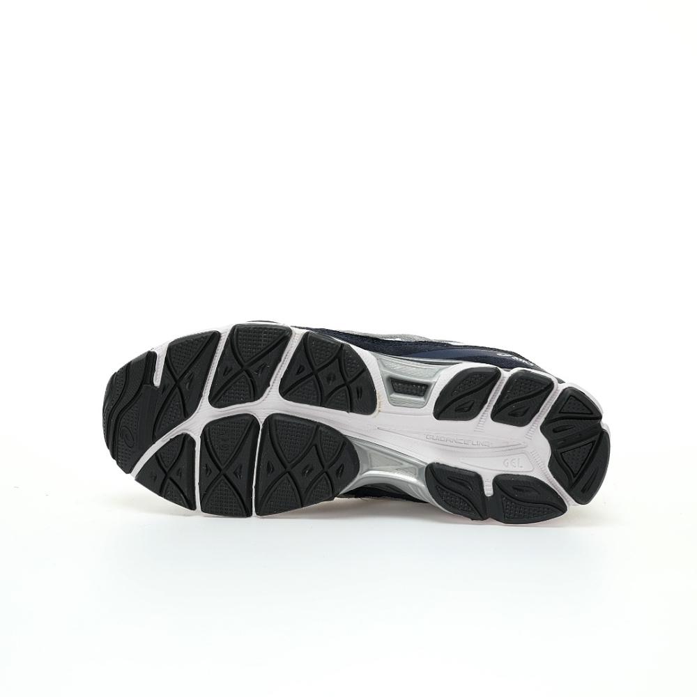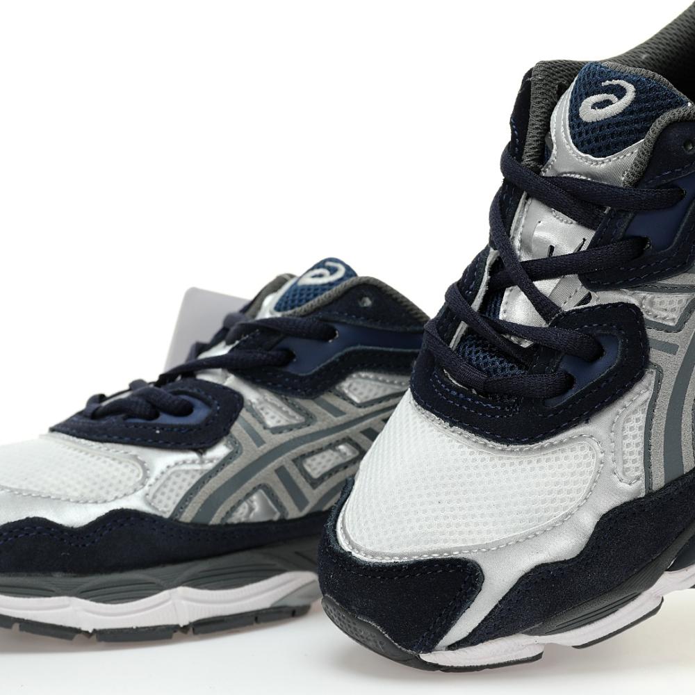 - تفاصيل إضافية: يتميز بنظام أربطة تقليدي باللون الكحلي. منطقة الكعب والياقة مبطنة بشكل مريح لدعم الكاحل وتقليل الاحتكاك مع تفاصيل بالأبيض والكحلي والفضي والرمادي وشعار ASICS باللون الكحلي أو الفضي على اللسان. شعار ASICS يظهر بوضوح على الجانب.