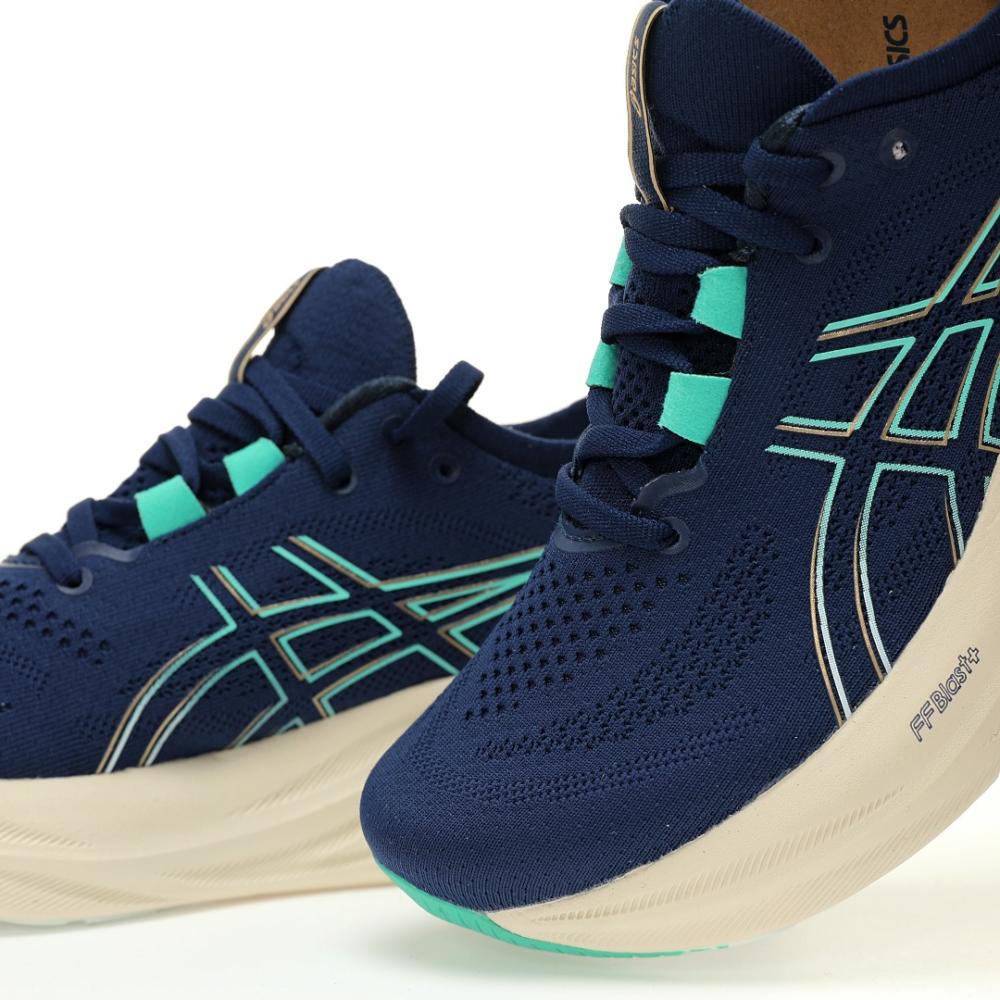 - اللون: في هذي اللقطة، الحذاء كله جاي بلون أزرق كحلي أو نيلي أنيق وعملي في الجزء العلوي مع شعار ASICS باللون الأبيض المحدد بالأخضر النعناعي أو التركواز بشكل بارز. النعل الأوسط يجي بلون بيج فاتح أو كريمي مع لمسة من الأخضر النعناعي في الجزء الأمامي والنعل الخارجي أسود مع لمسات خضراء. هالتوليفة اللونية أنيقة وعصرية مع لمسة منعشة.