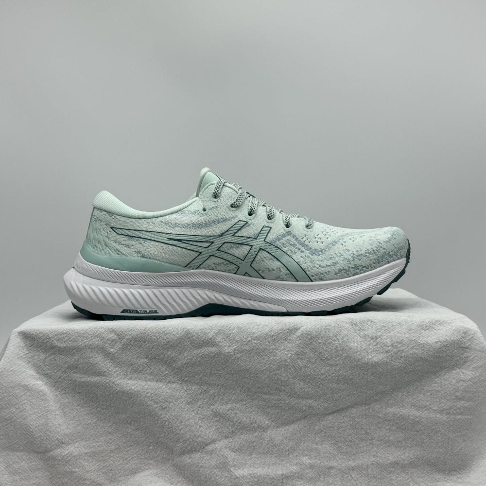 - اللون: في هذي اللقطة، يغلب على الحذاء اللون الأخضر السماوي الفاتح والمنعش في الجزء العلوي مع تداخلات بخطوط باللون الأخضر السماوي الداكن أو التركواز. شعار ASICS يظهر باللون الأبيض مع تحديد باللون الأسود في الخلف. النعل الأوسط يجي بتصميم ثنائي اللون، أخضر سماوي فاتح في الجزء العلوي وأبيض في الجزء السفلي مع طبقة بارزة باللون الأسود في الجزء الخلفي. النعل الخارجي باللون الأسود مع لمسات من الأبيض والأخضر السماوي الداكن. هالتوليفة اللونية هادية وعصرية وتلفت الأنظار.