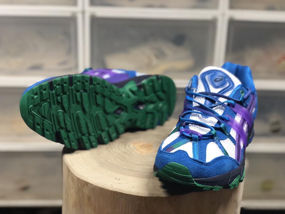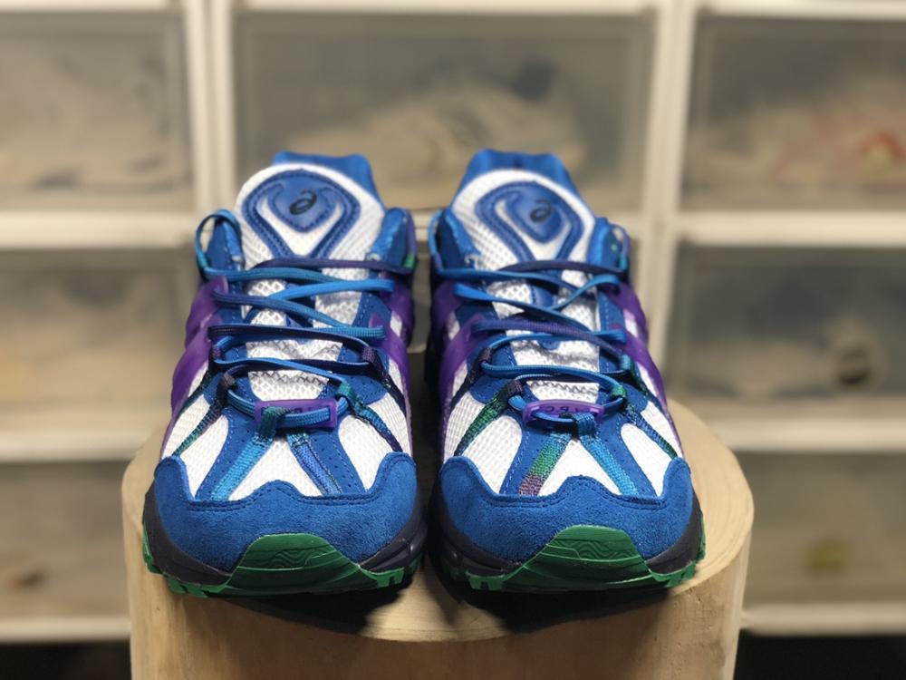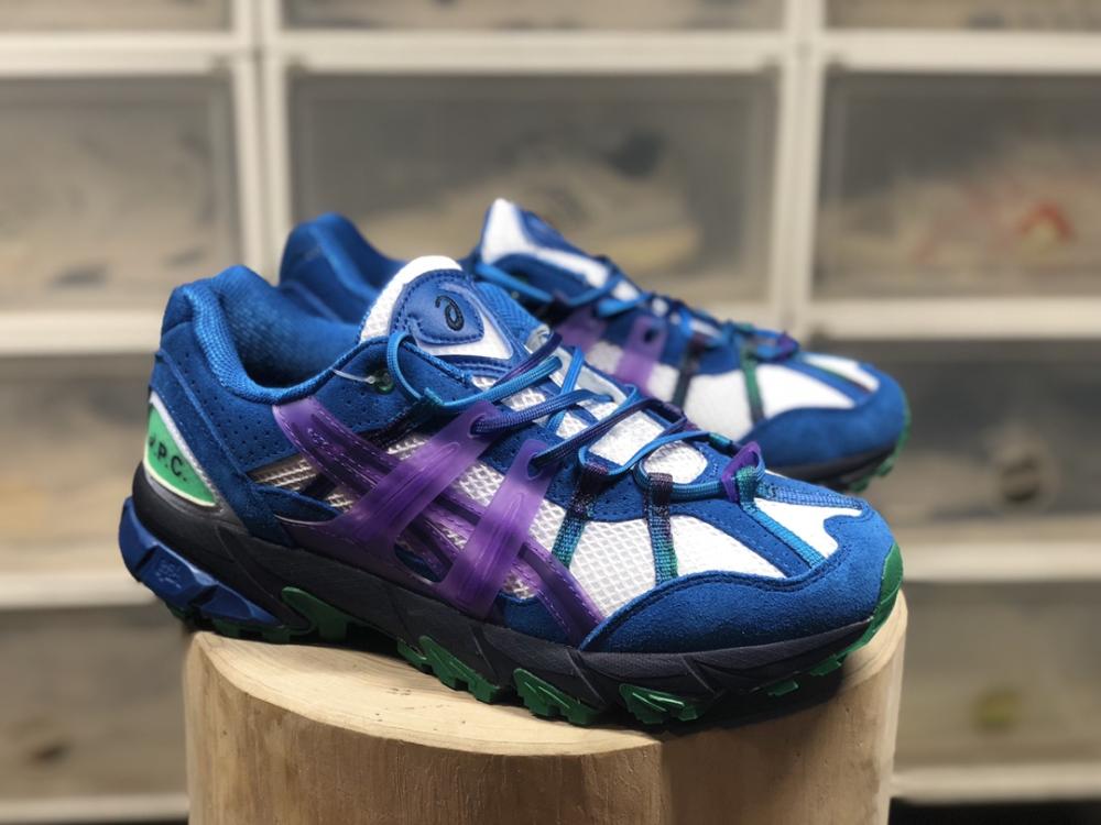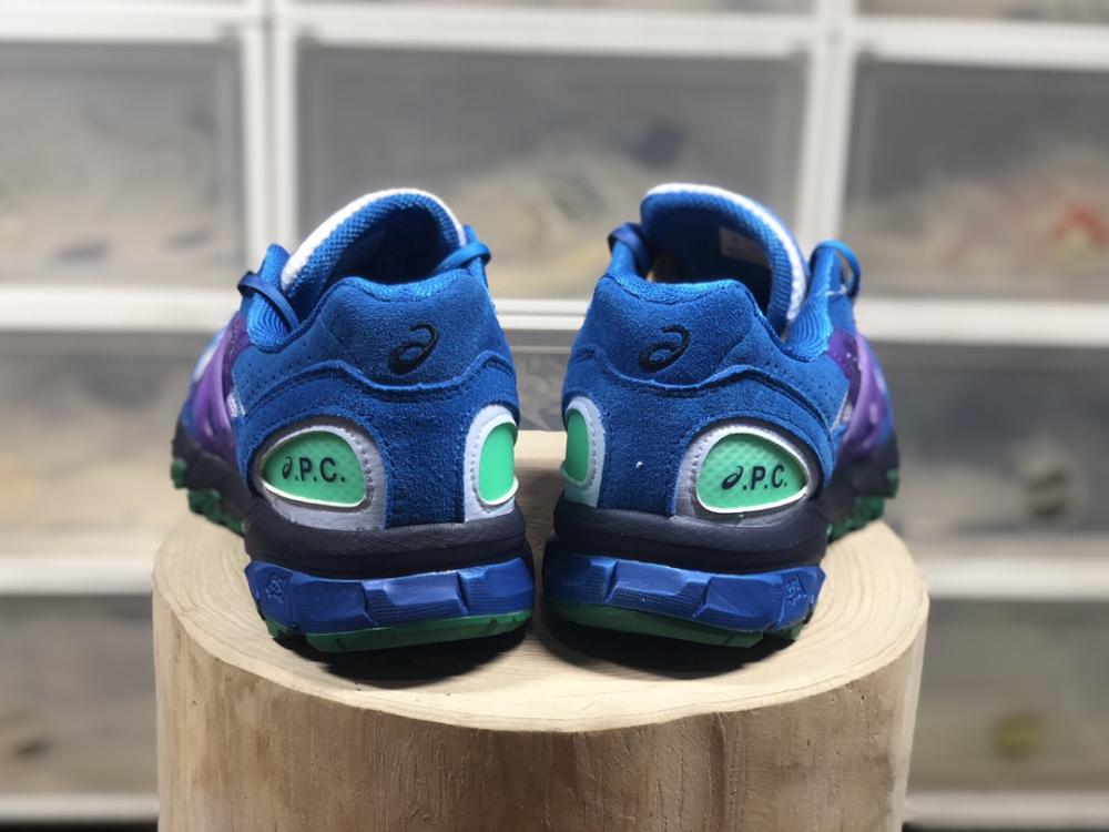 - تفاصيل إضافية: يتميز بنظام أربطة متعدد الألوان يجمع بين الأزرق والأخضر والبنفسجي. منطقة الكعب والياقة مبطنة بشكل مريح لدعم الكاحل وتقليل الاحتكاك مع تفاصيل بالأزرق والأبيض والأخضر والبنفسجي. شعار ASICS يظهر بوضوح على الجانب باللون البنفسجي الشفاف، بالإضافة إلى شعار A.P.C. على الجانب الآخر.