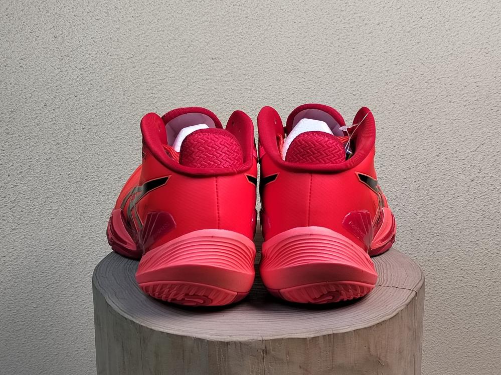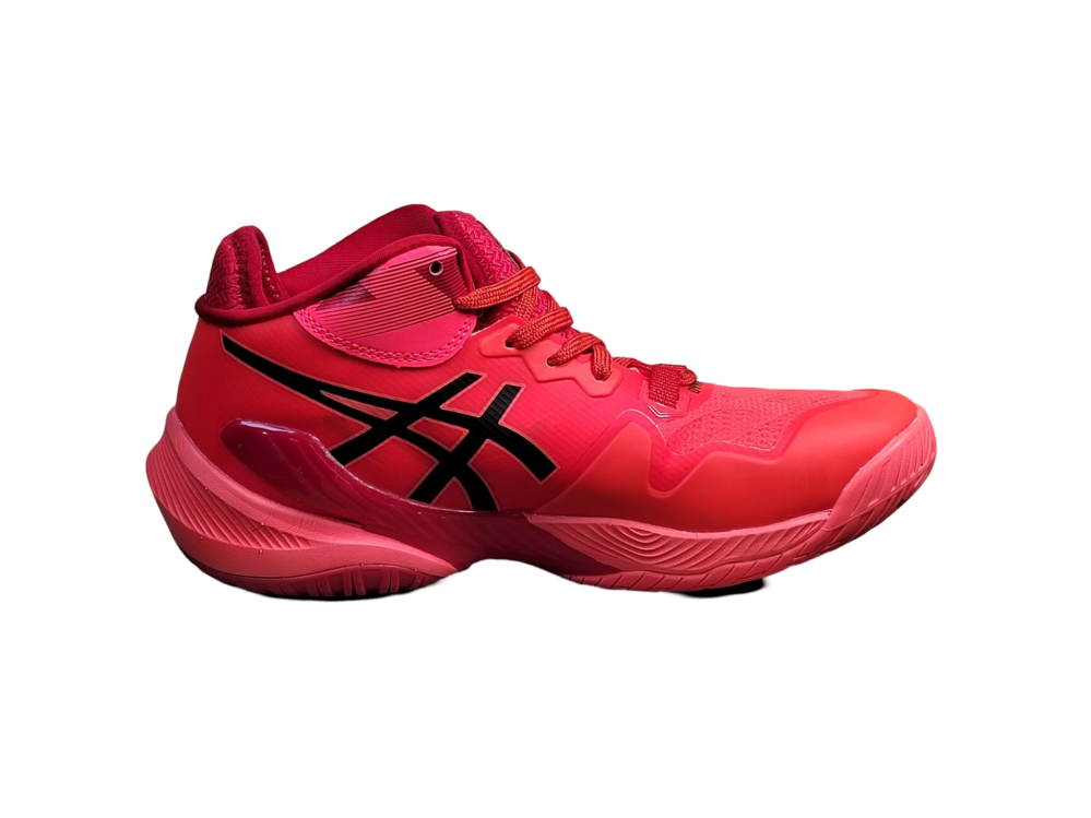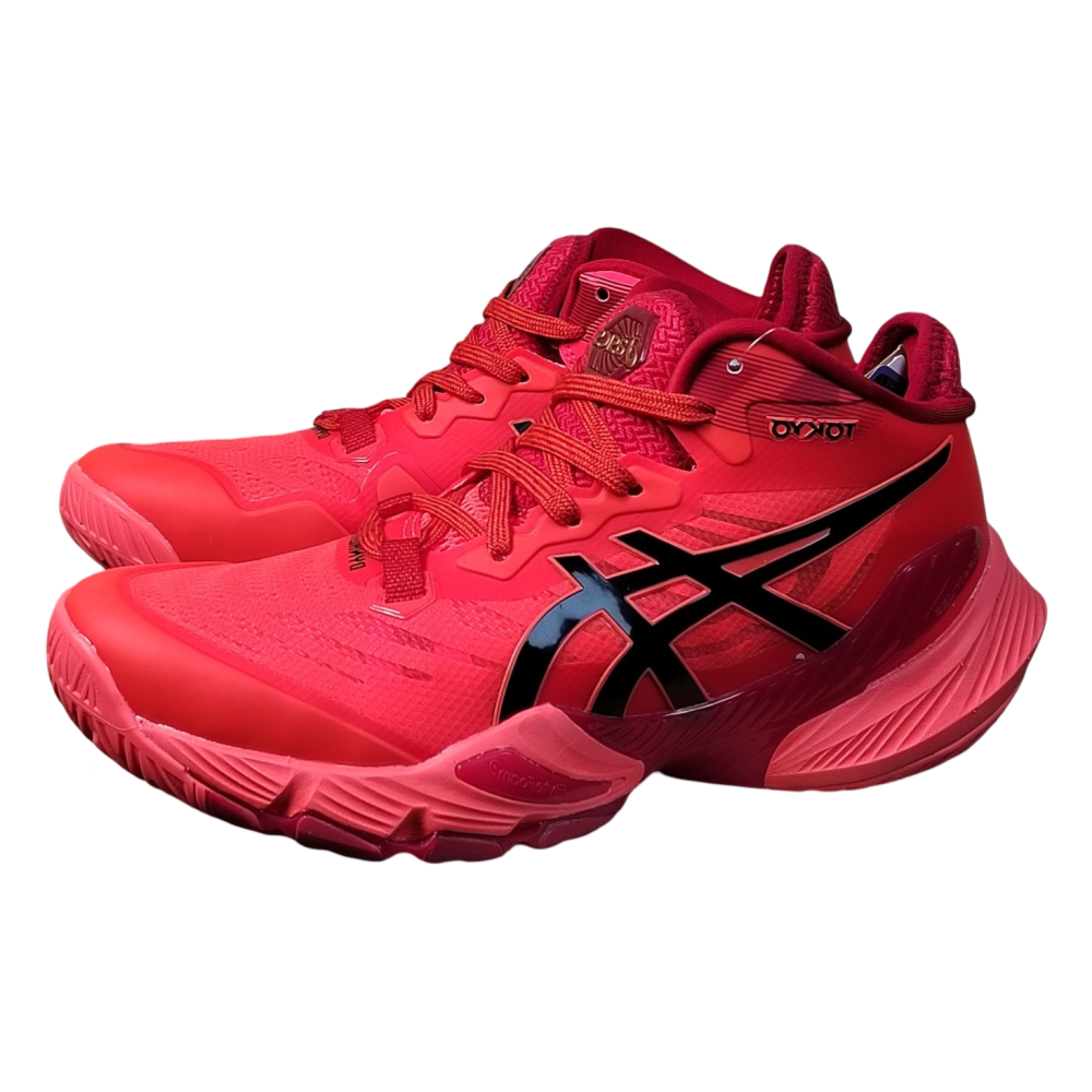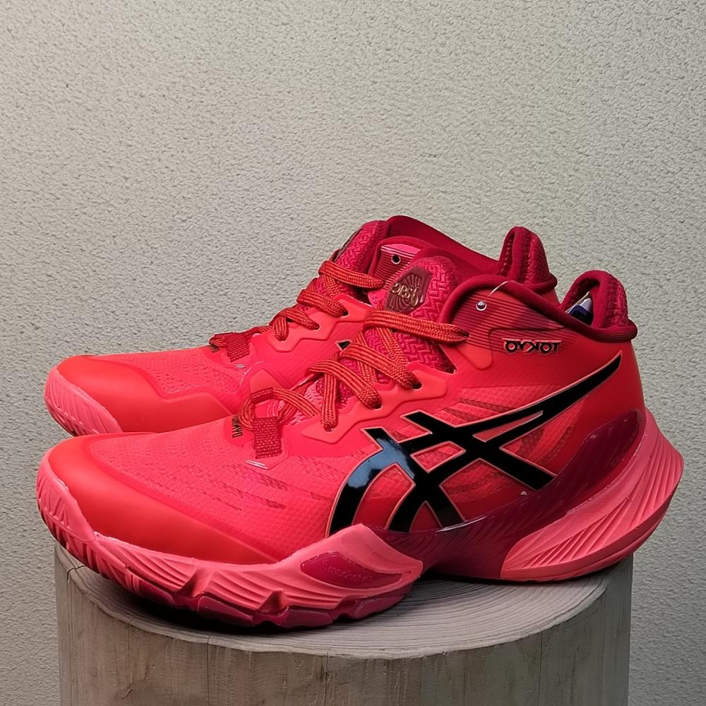 - اللون: في هذي اللقطة، الحذاء جاي بتوليفة لونية موحدة بالكامل باللون الأحمر الناري (Fiery Red) في الجزء العلوي وشعار ASICS والنعل الأوسط والنعل الخارجي. هذا اللون الموحد والجريء يعطي مظهرًا قويًا وملفتًا ويتناسب مع الأجواء الحماسية لمباريات الكرة الطائرة.
