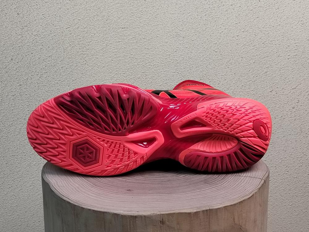 - النعل الخارجي (Outsole): الجزء السفلي مصنوع من مطاط متين ومقاوم للانزلاق مع تصميم بنقشة توفر ثباتًا ممتازًا على أرضية الملعب الداخلية، مما يمنع الانزلاق ويساعد على الحركة السريعة.